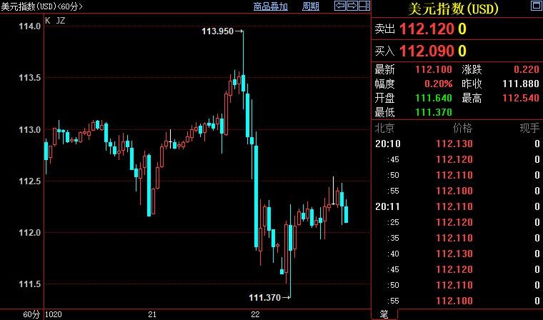 北京时间20:11, 现货黄金 下跌0.40%至1649.35美元/盎司;COMEX期金主力合约下跌0.14%至1653.7美元/盎司; 美元指数 上浮0.22%至112.120。
