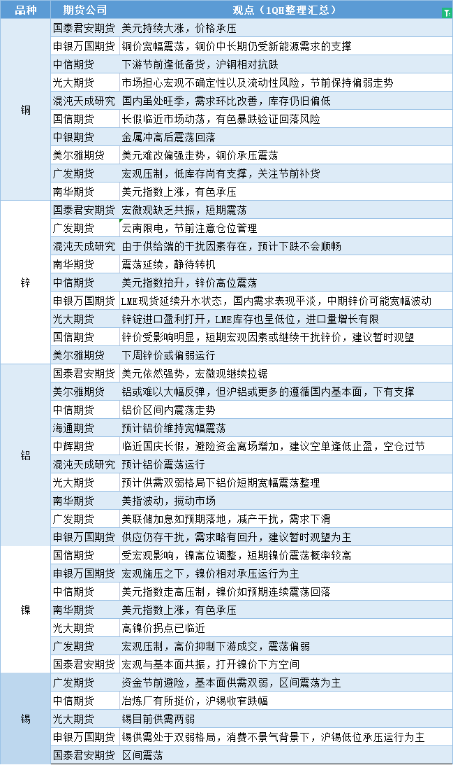 标题:期货公司观点汇总一张图:9月27日有色系(铜、锌、铝、镍、锡等)