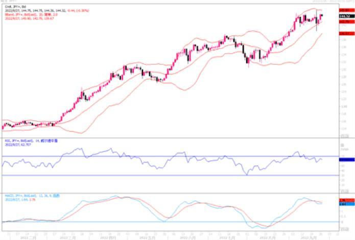 美元兑日元 周一(9月26日)上涨0.84%至144.585。上周四触及的24年峰值145.90,但当天在日本20多年来首次买入日元进行干预后,美元下挫至140.31左右。根据东京外汇市场经纪公司的估计,日本在那次卖出美元、买入日圆的干预中估计花费了约250亿美元。然而在欧美不断紧缩货币政策的背景下,只要日本央行继续维持现有宽松货币政策不变,日元的贬值趋势就难以扭转。而日本央行的大举干预效果也将是短暂的。日图仍在高位震荡,短期均线走平,仍有望在145下方受阻,下方支持143。4小时图大阴线连续小阳线修正,但上行显得谨慎,下方支持关注143.40一线。小时图持续反弹,但多空纠结,随机指标在144上方有回落信号。上方的强大阻力在145.00水平附近。料美元多头会继续尝试突破该水平,若日本央行无干预行动出现,则美日将继续向更高蜂试着挺进。