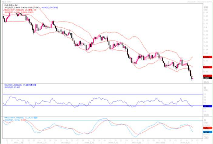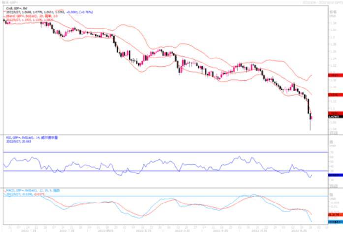 周一(9月26日)美元兑一篮子货币=USD上涨0.804%,报114.05,稍早触及2002年5月以来最高114.58。 欧元兑美元 也触及0.9528美元的20年新低,尾盘下跌0.81%。在经济方面,欧元区9月份制造业PMI初值为48.5%,服务业PMI初值为48.9%,综合PMI初值为48.2%,均明显低于50%临界水平,欧元区经济显现衰退迹象。而且随着欧洲能源危机发酵, 欧元兑美元 的弱势仍难以得到缓解。技术层面上,日图跌破0.9800一线加速下行,整体仍看跌。4小时图短期均线系统空头排列,下行动能猛烈但在20年来低位0.9550得到一定的空头回补盘推动暂时获得反弹喘息的机会。日线级别图上布林带喇叭口扩张,欧元的跌势明显,上方初步阻力在0.9700,继而是0.9833。下方关键支撑在隔夜低点0.9553,若跌穿历史的低位纪录恐会继续创出。近期预料该货币对将会进入区域震荡整理走势,区间主要在0.95-0.98之间。