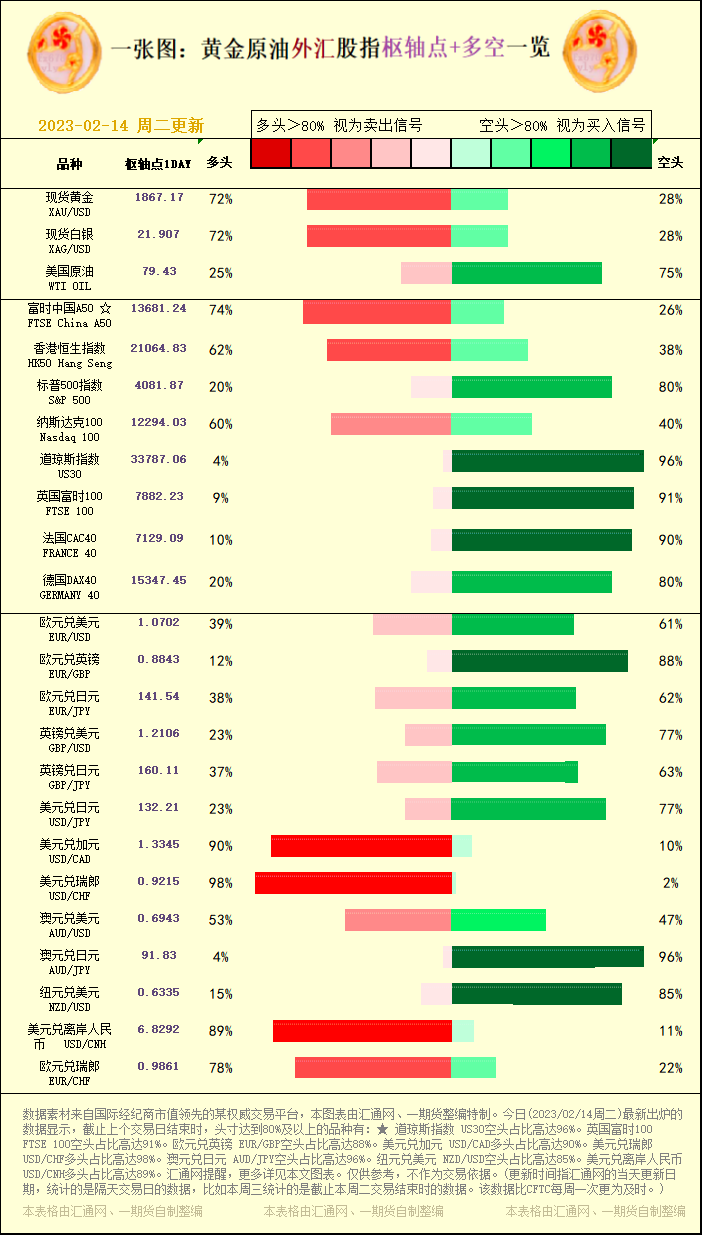 一张图:黄金原油外汇股指"枢纽点+多空占比"一览(2023/02/14周二)