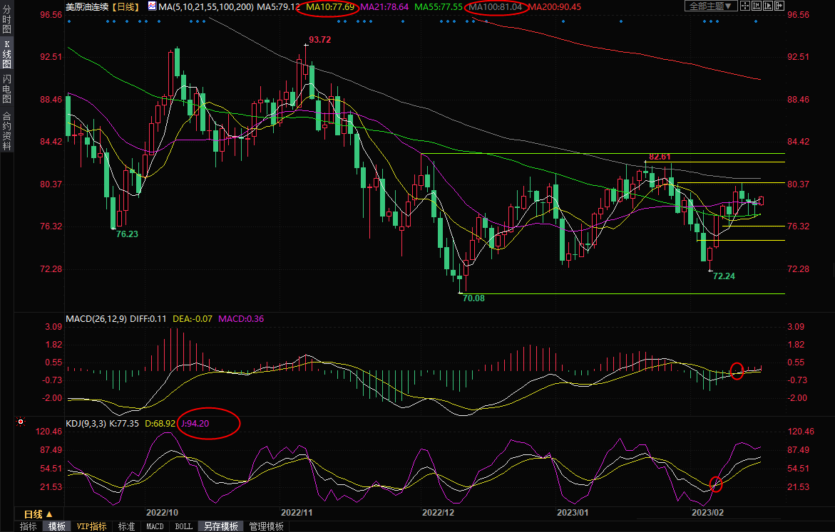 日线级别: 震荡;MACD金叉,KDJ金叉,虽然之前油价在100日均线附近受阻后回落,但10日均线给油价提供了较好的支撑,连续两个交易日探底回升后,油价有望延续72.24以来的涨势,初步阻力在周二高点79.60附近,然后是80整数关口,较强的阻力在100日均线81.04附近,若能顶破该阻力,则增加短线看涨信号;进一步阻力在1月23日高点82.61附近,12月1日高点阻力在83.31附近。