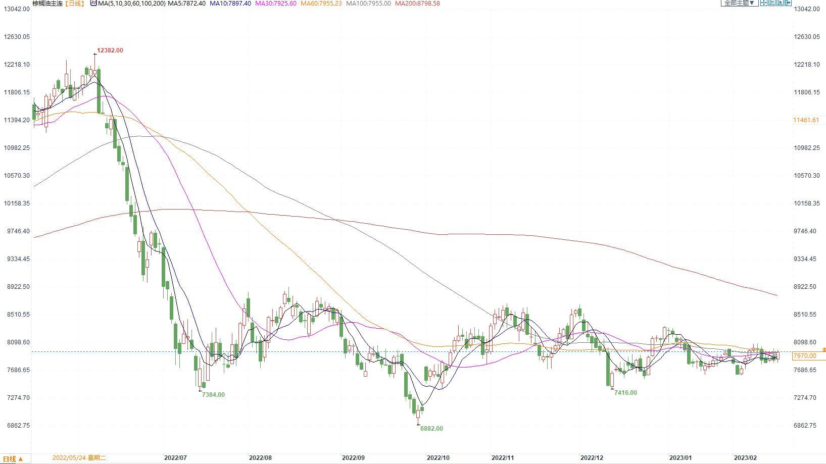棕榈油2305合约日内涨0.89%,收盘7970元/吨,广州市场棕榈油7900元/吨。