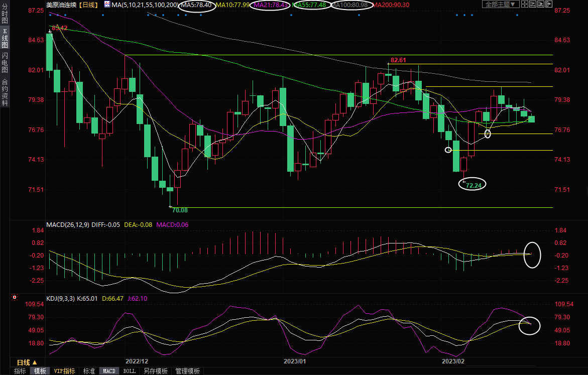 日线级别: 震荡;MACD金叉被破坏并有死叉的趋势,KDJ接近死叉运行,油价上一交易日反弹受阻并回落至布林线中轨下方,目前正试探55日均线支撑,接近失守所有均线支撑,短线下行风险有所增加,留意2月9日低点76.51附近支撑,若失守该支撑,则增加短线看空信号;进一步支撑在布林线下轨74.56附近,2月3日低点支撑在73.09附近,2月6日低点支撑在72.44附近。