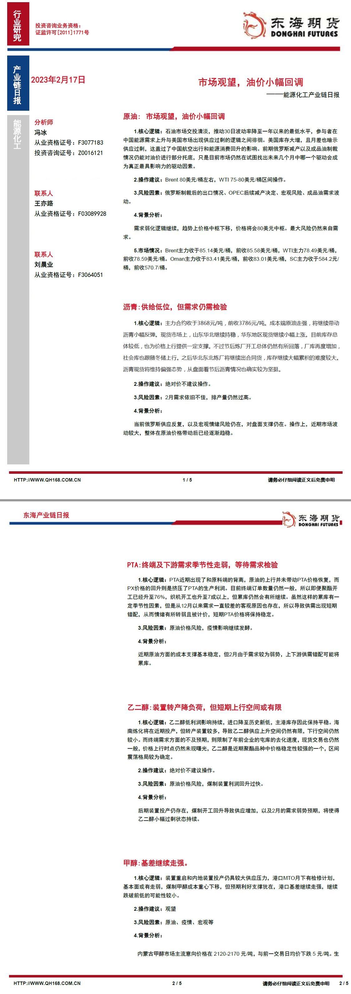 标题:【东海期货2月17日产业链日报】能化篇:市场观望,油价小幅回调