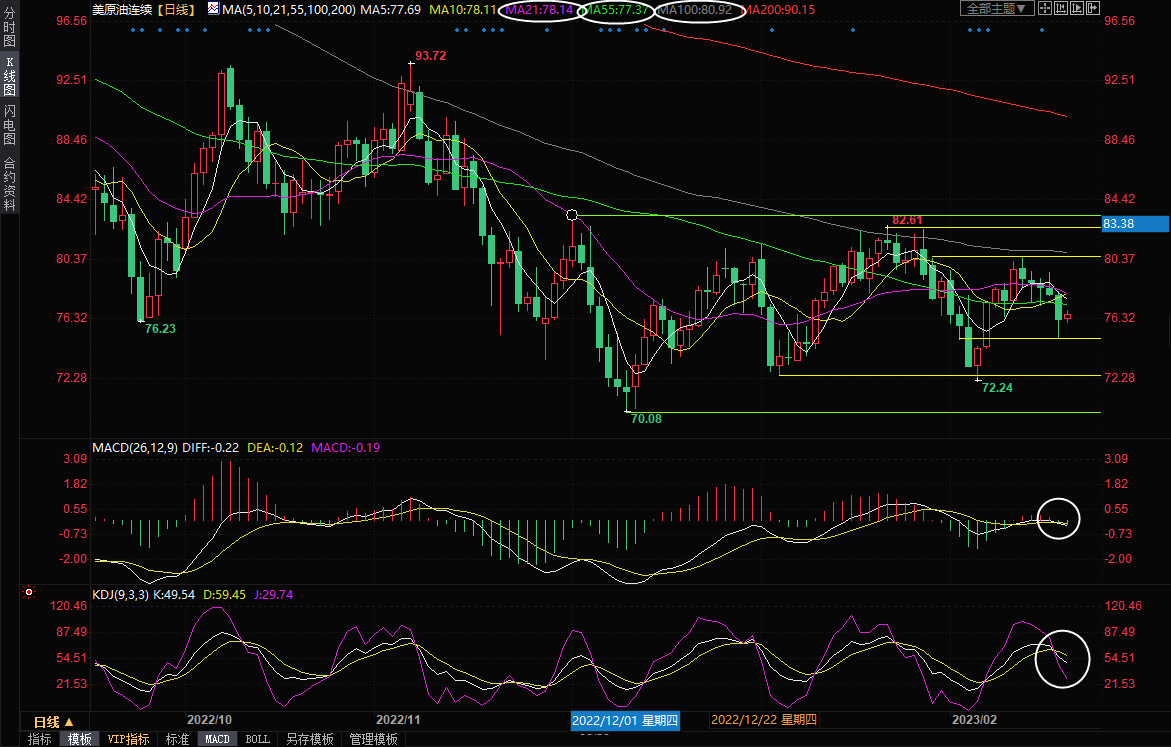 日线级别: 震荡;MACD轻微死叉,KDJ死叉,油价回落至布林线中轨和所有均线下方,在收复55日均线77.37前,短线略微偏向空头,初步支撑参考日内低点76.07附近,上周五低点支撑在75.05附近,布林线下轨支撑在74.31附近,如果失守该支撑,将增加短线看空信号。