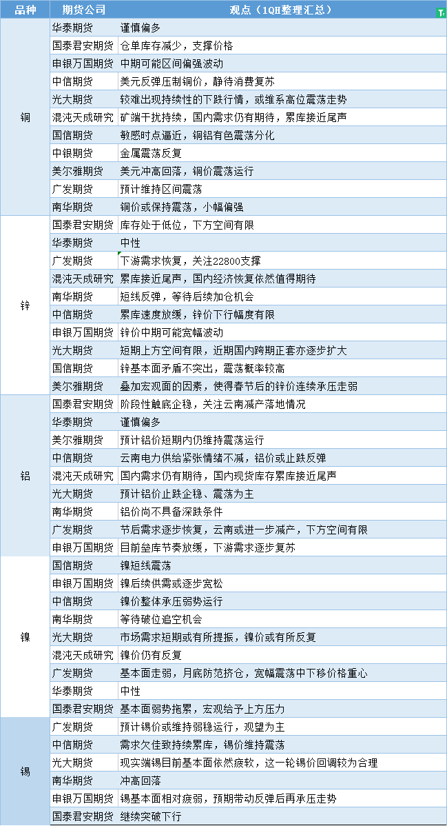 标题:期货公司观点汇总一张图:2月20日有色系(铜、锌、铝、镍、锡等)