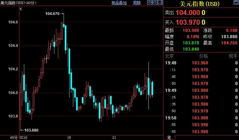 北京时间19:50, 现货黄金 下跌0.36%至1834.74美元/盎司;COMEX期金主力合约下跌0.35%至1843.7美元/盎司; 美元指数 上涨0.10%至103.990; 英镑兑美元 上涨0.64%至1.2115。