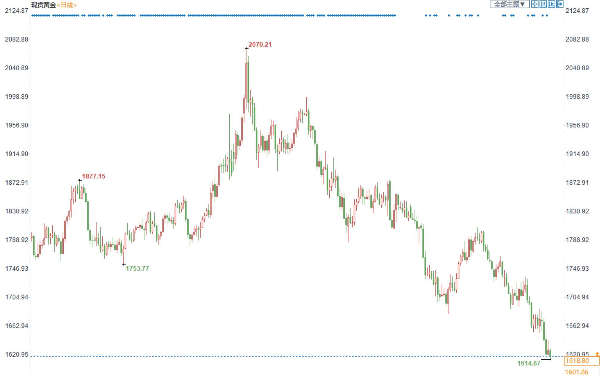 【今日行情】金银涨跌互现。AU2212收盘价为385.90,小幅收涨0.43%;AG2212收盘价为4281,收跌1.99%。 美元指数 高位继续走强,创新高至114上方;十年期美债收益率突破4%,创逾十年新高,实际利率冲至1.64%,对金银上方的压制增强。