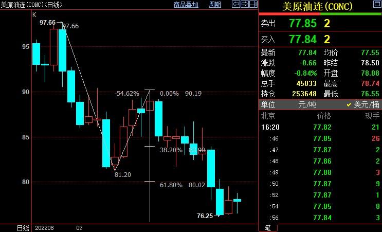 北京时间16:22,NYMEX原油期货下跌0.74%至77.92美元/桶;ICE 布伦特原油 期货下跌0.58%至84.37美元/桶。