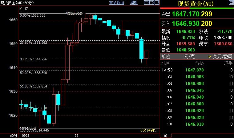 北京时间14:53, 现货黄金 下跌0.80%至1646.42美元/盎司;COMEX期金主力合约下跌0.93%至1654.4美元/盎司; 美元指数 上涨0.71%至113.495。