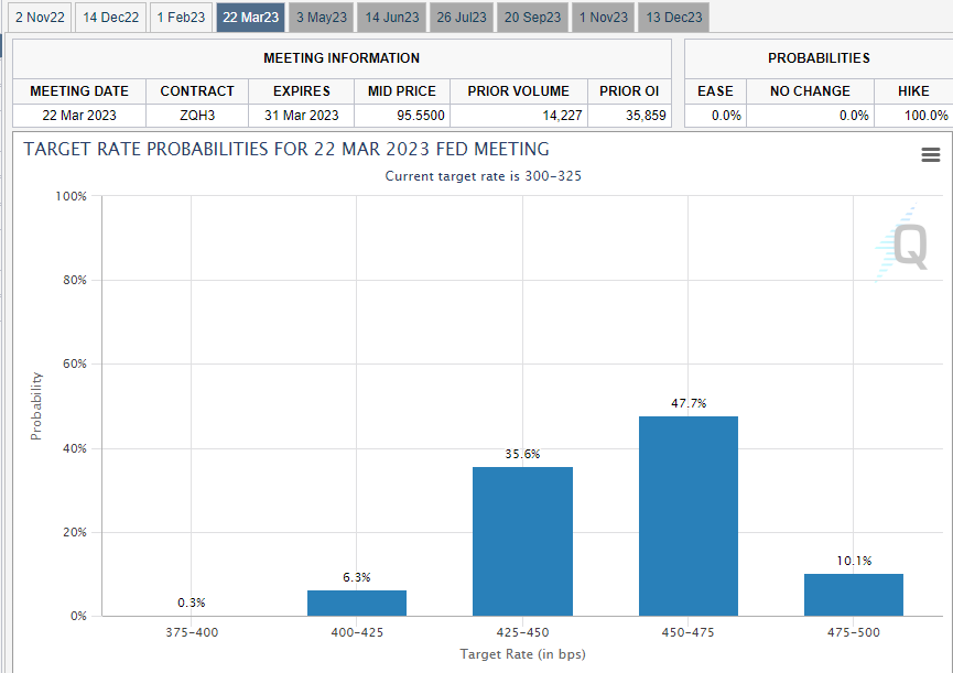 但埃文斯指出,没有任何事能让美联储偏离正轨,“我们真的需要控制通胀。”根据芝商所的“联储观察”工具最新数据显示,市场普遍预计,美国联邦基金利率区间将在明年3月达到本轮加息周期的峰值4.5%-4.75%。