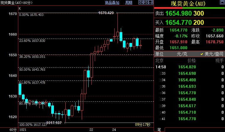 北京时间14:58, 现货黄金 下跌0.07%至1654.84美元/盎司;COMEX期金主力合约上浮0.20%至1659.7美元/盎司; 美元指数 上涨0.23%至112.134。